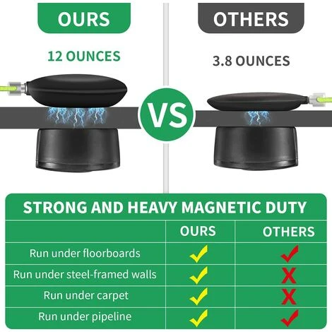 【LES GRANDS AIMANTS SAUTENT PAR-DESSUS LES OBSTACLES】Vous vous assurez que les câbles de la maison ont un chemin clair à parcourir alors que vous n’êtes pas exactement là où il se trouve. La force de l’aimant est ce qui fait de cet outil ce qu’il est, les grands aimants peuvent sauter rapidement au-dessus des obstacles. Vous pouvez très facilement le faire passer sous les lames de plancher avec précision.