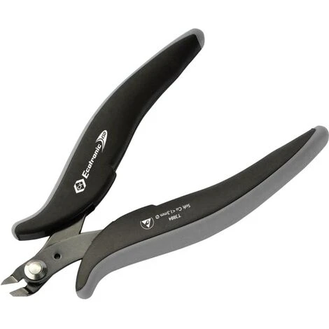 Pince coupante de côté de précision légère, pour des découpes très précises(pour la micro-électronique et la mécanique de précision par exemple). Pour couper les fils de cuivre souples jusqu’à 1,3 mm de diamètre / 16 AWG. Tranchant à l’arrière pour des découpes précises de commutateurs DIP sur des circuits intégrés. Mini tête de coupe, de forme conique, pour faciliter l’accès dans les endroits exigus. Lame affutée avec tranchant de précision pour une découpe nette. Lame en acier trempé spécial outils, pour une puissance de coupe longue durée. Poignées à gaine dissipative électrostatique – Résistance de fuite 10⁸. Poignées bi-matières en version incurvée pour travailler confortablement. Surface brunie en noir pour protéger contre la corrosion et réduire les éblouissements. Ressort de rappel pour un confort optimal en cas de travaux répétitifs. Articulation avec rivet solide en acier inoxydable.