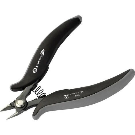 Pince coupante diagonale légère pour applications de coupe de précision Convient à la coupe de fils de cuivre mous jusqu’à 1,6 mm de Ø / 14AWG Tête de coupe conique et dégagée permettant l’accès dans les espaces étroits et restreints Taillants tranchants affûtés de précision pour coupe à ras Taillant en acier à outils spécial trempé pour assurer la performance de coupe à long terme Branches dissipant les charges électrostatiques – dissipation 10⁸ Branches bi-composants au design galbé pour le confort de travail Finition oxydée noire assurant la résistance à la corrosion et réduisant l’éblouissement Ressort de rappel fonctionnant sans à-coups pour un confort accru lors de travaux répétitifs Articulation à rivet solide en acier inoxydable