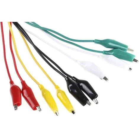 Cordons avec pinces crocodiles. Cordons de différentes couleurs équipés d’une pince crocodile isolée à chaque extrémité. Fournis sous forme d’un jeu de 10 câbles comprenant 1 paire de chaque couleur.