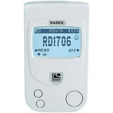 RADEX RD1706 est un nouvel ajout à la fameuse famille des appareils RADEX.Cet appareil peut être utilisé par des professionnels qui travaillent avec des sources de radiation ionisante aussi bien que par des personnes ordinaires qui désirent déterminer, avec une haute précision, le niveau de radiation de places et des objets autours d’elles.Le RD 1706 donne la possibilité à un nombre croissant de personnes de réaliser un premier niveau de contrôles directs de l’état radiologique de leur environnement quotidien afin de déceler des situations radiologiques nettement anormales. à travers l’utilisation d’un petit compteur Geiger, il permettra à chacun d’acquérir des notions de base sur la radioactivité, sa nature, les moyens de la détecter dans notre environnement quotidien, et ses effets sur la santé.Voici des capacités de RADEX RD1706- Précision très fine L’étendue d’indication élargie (jusqu’ à 999.0 µSv/h).- L’étendue de l’énergie Gamma mésurée: 1 1.25 MeV.- L’étendue de radiation X: 0.03 3.0 MeV.- L’étendue de radiation Beta: 0.25 3.5 MeV.- Capacité d’enregistrer la radiation des rayons x.- La période d’opération continue: ~500 heures.- Temps d’observation réduit (un cycle d’observation de 26 sec seulement)Ce modèle utilise deux compteurs Geiger Muller SBM20 1, un pour beta et un pour gamma rayonnement.L’utilisation de deux senseurs séparés permet de minimiser le temps d’observation de 40 jusqu’à 26 sec tout en améliorant la précision. L’étedue des indication est 100 fois plus large, comparé à RADEX RD1503.Au cas de la résence de sources de radiation importante, le temps d’observation est automatiquement minimisé jusqu’à une seconde seulement. Cette mésure est nécessaire pour assurer la sécurité des spécialistes en contact avec la radiation.En plus, la plupart des autres qualités importantes des appareils de la famille RADEX a été retenue, à savoir, le moniteur LCD large et commode, trois boutons d’opération, l’indicateur de la batterie, le retroéclairage et les paramètres personnels, tels que l’activation d’alarme, sa volume et bien d’autres caractéristiques.caractéristiques du RD1706:Rayonnements ionisants détectés Rayons X, gamma et particules bêtaGamme de détection des rayonnements gamma 100 keV à 1 250 keVGamme de détection des rayonnements X30 keV à 3 000 keVGamme de détection des particules bêta 400 keV à 3 500 keVUnité de mesure microSievert par heure (µSv/h) (1)Gamme de mesure 0,05 à 999 µSv/hIncertitude du résultat ± (15+6/D)% (2)Cycles de mesure 10×10 secondesDurée d’affichage de la mesure Permanente (3)Capteur Tube Geiger-Müller SBM 20-1 (4)Seuils d’alarme 0,05 à 1,2 µSv/h (réglage par pas de 0,05 µSv/h)Alimentation 2 piles AAAAutonomie 300 heures (5)Gamme de températures -18°C à +45°CGamme d’humidité Moins de 80% RH à 25°CRadionucléide utilisé pour la calibration en usine Césium 137Dimensions 97x68x24 mmMasse (sans piles) 80 g