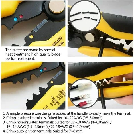 - Matériau de qualité : fabriqué en acier nickel ou chromé durable. La poignée de la pince à dénuder est soutenue par un mécanisme à ressort qui offre un confort supplémentaire et réduit trop la pression de la main. Cela vous permet de facilement dénuder, couper et sertir.