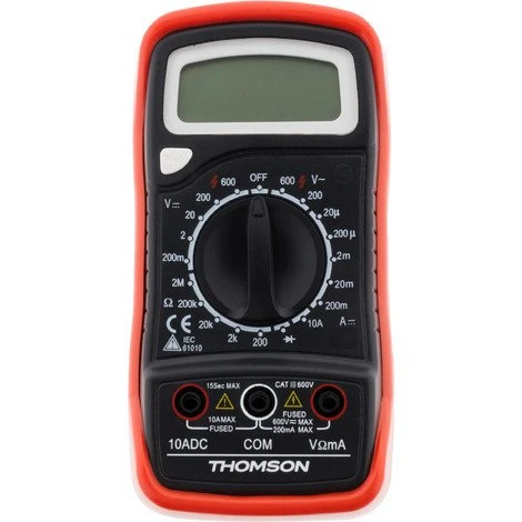 Ce multimètre Thomson dispose en outre d’un indicateur de batterie faible et est livré avec des pointes de test et une pile 9V 6F22. Certifié CE
