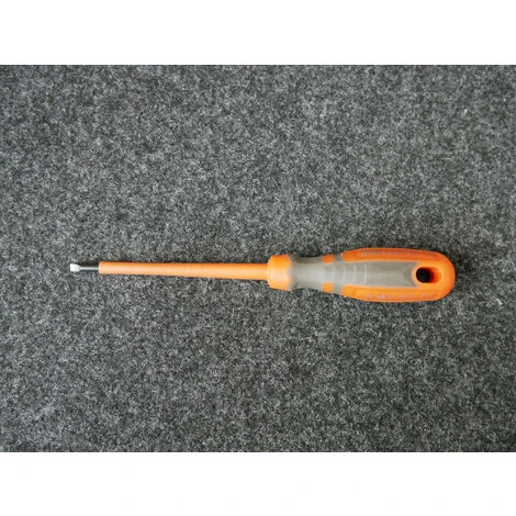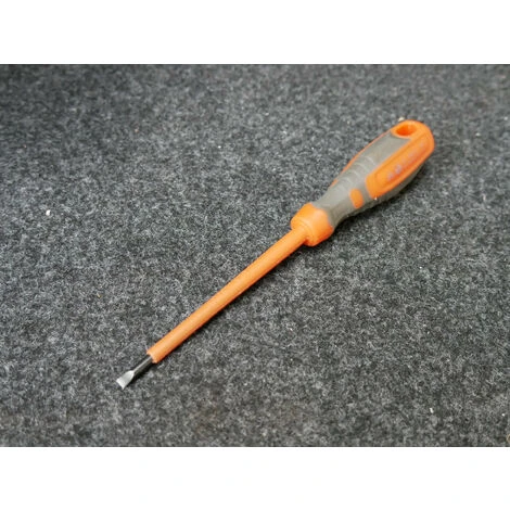 Tournevis plat isolé 1000VNORME :EN 60900 / CEI 60900 / NF ISO 2380-1UTILISATION :Pour le serrage des vis à tête fendue.CARACTÉRISTIQUES :Manche bi-matière ergonomique pour un bon maintien (notamment avec les gants isolants) et une transmission du couple confortable.Type d’empreinte : plat / fente.Trou d’accroche (anti-chute).PLUS PRODUIT :Identification rapide du type de tournevis : bague de couleur rouge et marquage de l’empreinte du tournevis sur l’extrémité du manche