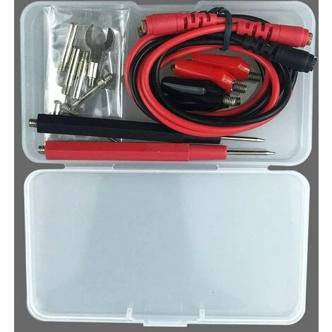Package inclut: 2pcs cbles de test Sondes de test 2pcs Goupilles de test de 2pcs 2pcs tranches de fourchette Pinces crocodiles 4pcs 4 pices fiches bananes. (Le magasin a plus de produits de soutien, si ncessaire, s’il vous plat cliquez pour entrer l’achat) .