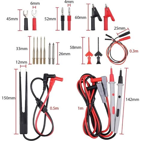 Le kit de 21 PIECES de cordons de mesure multimtre contient 4 aiguilles d’une paisseur de 2 mm et 4 aiguilles avec embouts plaqus or. .