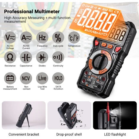 – en plus de mesurer la tension AC/DC, le courant AC/DC, la résistance, la diode, la capacité, la fréquence Transitor, la température et a une fonction de fil sous tension à mesurer et de ligne zéro avec le test à deux fils.
