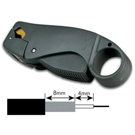 Dénudeur de câbles coaxiaux avec 3 couteaux réglables. Dénudage de câbles RG-58 / 59 / 62. Enlève également l’isolation extérieure.